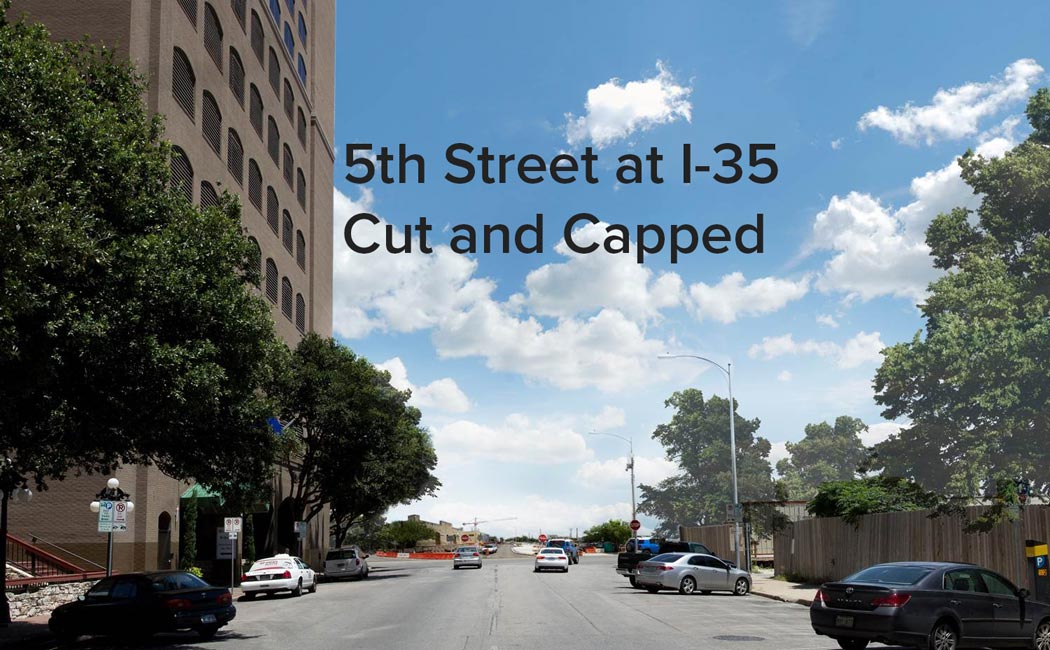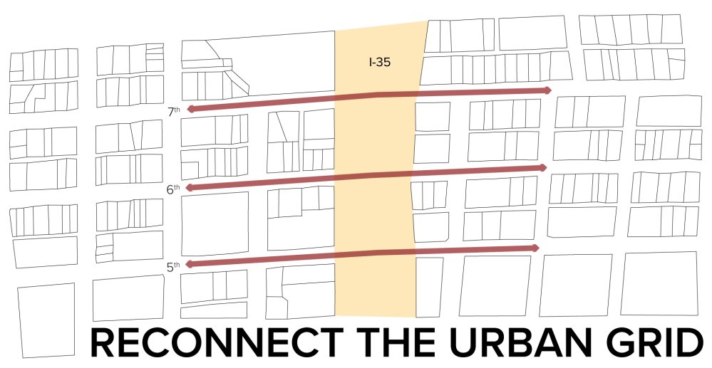 I-35’s current location is the ideal corridor for high-capacity transit. Stations downtown would connect the underground interstate and the street above with buses and light rail.